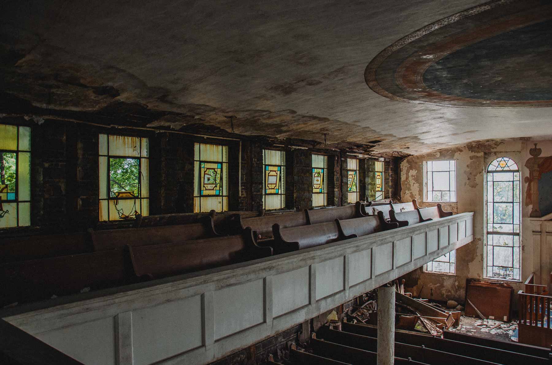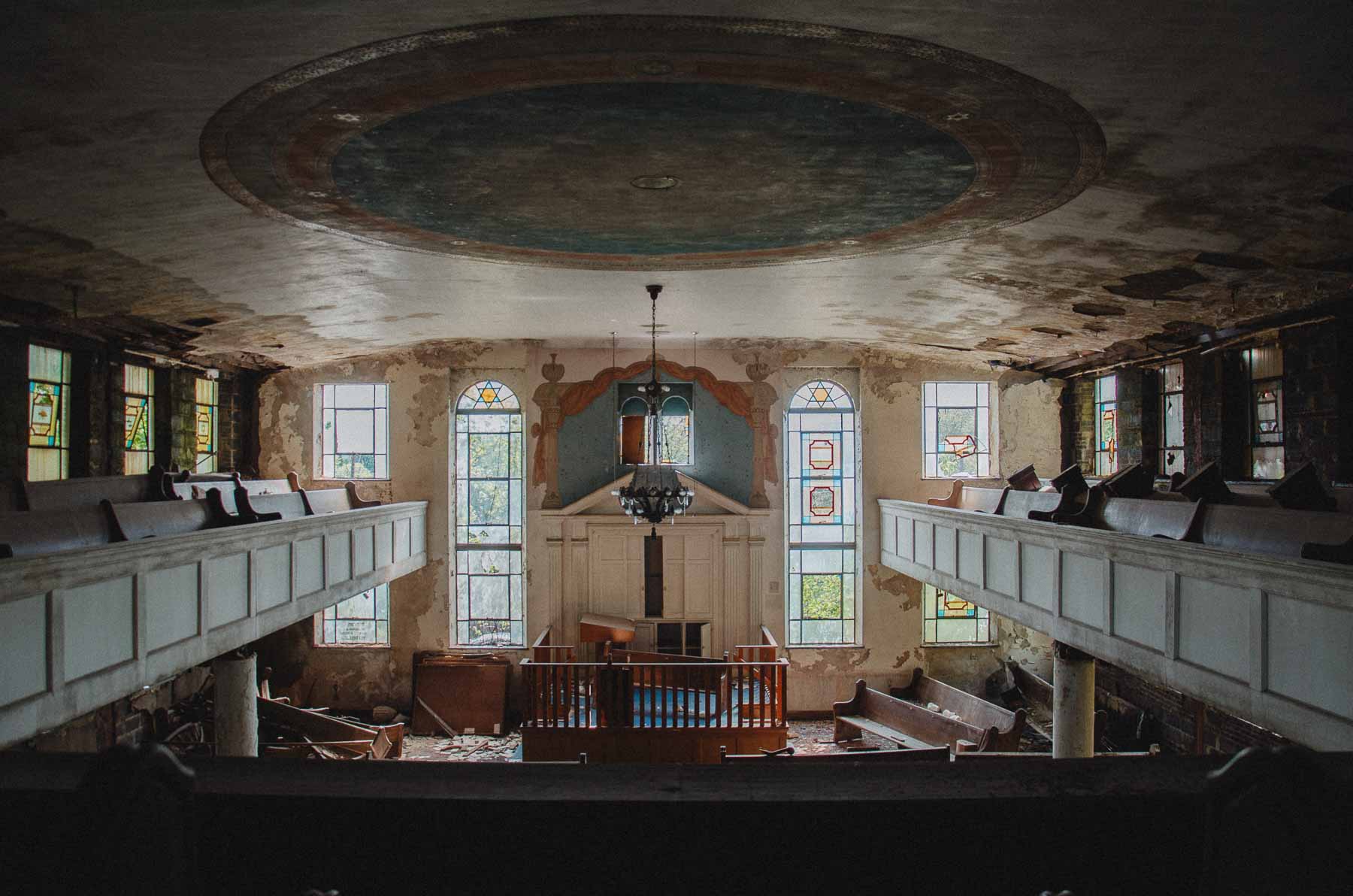 For decades the sanctuary hosted religious services, fundraisers, and neighborhood meetings, even as families gradually relocated to the suburbs following World War II. By the late twentieth century the congregation had merged elsewhere, yet locals continued to refer to the Joseph Avenue landmark as Temple B’Nai Israel—a name that still appears in community directories and on neighborhood tours. Subsequent church congregations kept the lights on for a time before deferred maintenance took its toll on the plaster, flooring, and balcony railings captured in these photographs.
